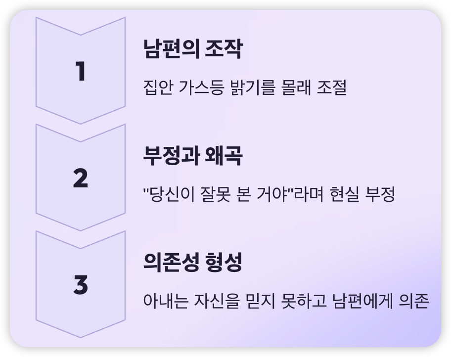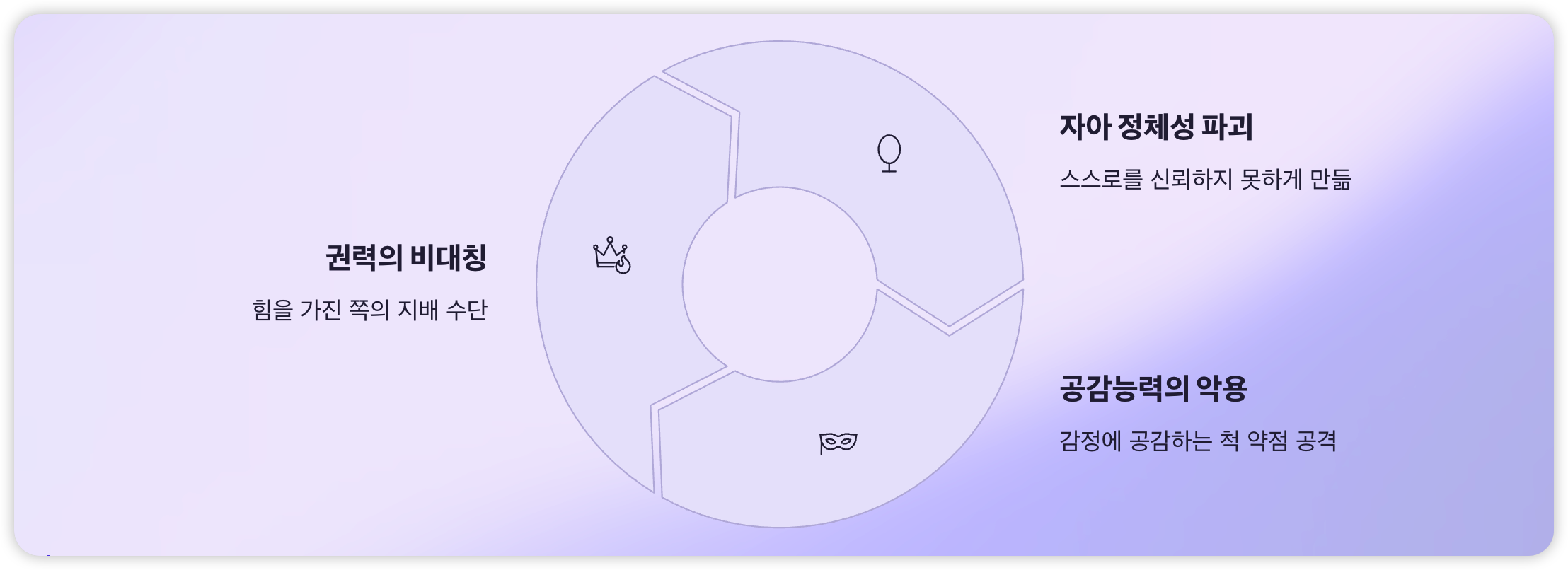 - 자아 정체성 파괴: 피해자가 스스로의 생각과 감정을 신뢰하지 못하게 만듦