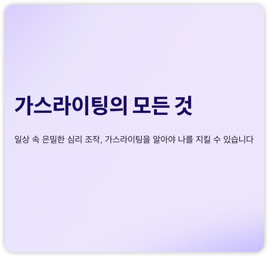 가스라이팅 뜻은 무엇일까요? 일상 속에서 은밀하게 이루어지는 심리 조작의 대표적인 형태인 가스라이팅의 정의, 유래, 심리학적 배경과 실제 사례까지 쉽고 명확하게 알려드립니다.