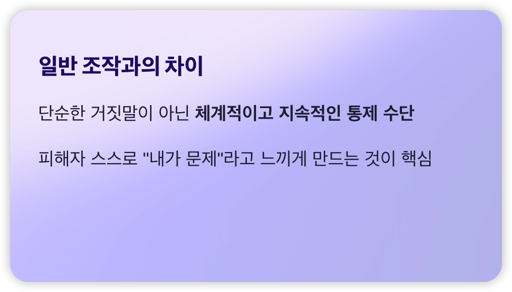 일반적인 거짓말이나 조작과 달리, 가스라이팅은 지속적이며 체계적으로 상대방을 통제하기 위한 수단입니다. 피해자는 자신이 문제라고 느끼게 만드는 점에서 차별화됩니다.