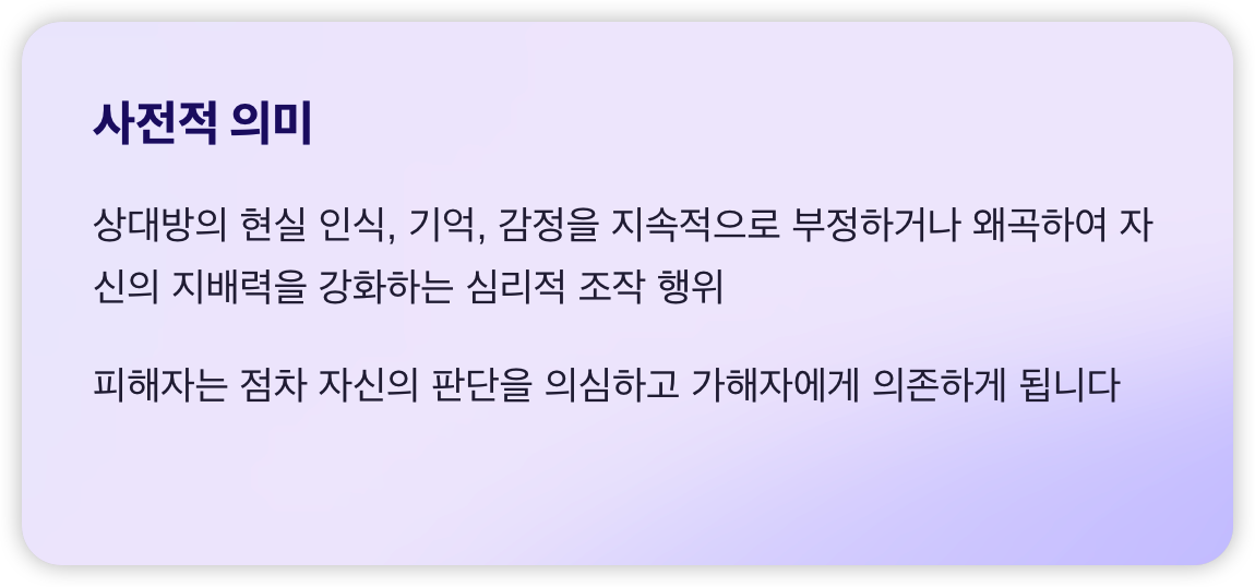 가스라이팅(Gaslighting)은 상대방의 현실 인식, 기억, 감정 등을 지속적으로 부정하거나 왜곡하여 자신의 지배력을 강화하는 심리적 조작 행위를 말합니다.
