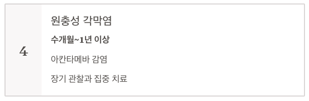 - 원충성(아칸타메바): 수개월~1년 이상 치료 필요