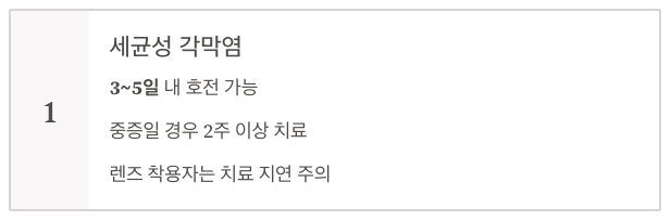 | 세균성 | 3일~2주 | 항생제 안약 | 빠름 (조기 치료 시) |