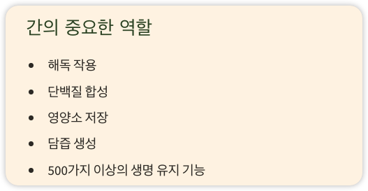 간은 해독, 단백질 합성, 영양소 저장, 담즙 생성 등 500가지 이상의 기능을 수행하는 중요한 기관입니다.