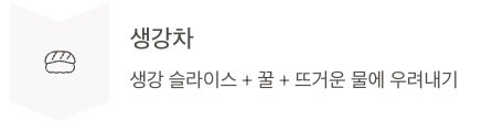 - 생강차: 생강 슬라이스 + 꿀 + 뜨거운 물에 우려내기