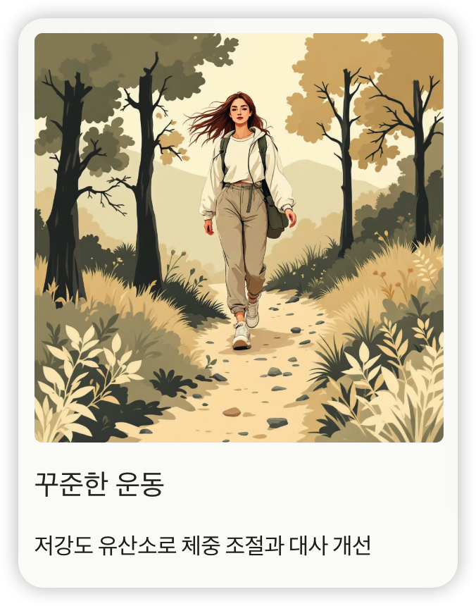 저강도 유산소 운동(걷기, 요가, 수영)을 꾸준히 하는 것이 좋습니다.