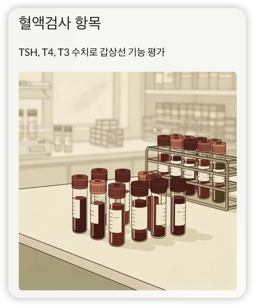 | TSH (갑상선자극호르몬) | 0.4~4.0 mIU/L | 상승 |