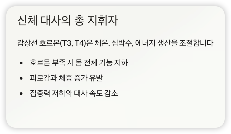 이 호르몬은 인체의 대사 속도, 체온, 심박수, 에너지 생산 등을 조절하는 핵심 물질입니다.