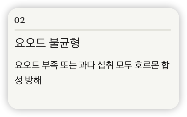 요오드가 너무 적거나, 반대로 과다할 때 모두 호르몬 합성이 방해받아 저하증이 발생할 수 있습니다.