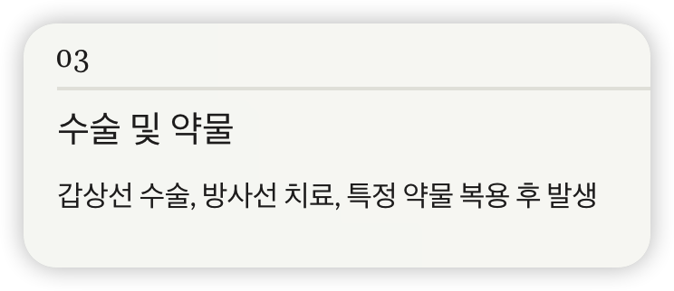 - 갑상선암 수술 또는 방사선 요오드 치료 후 호르몬 생성 저하