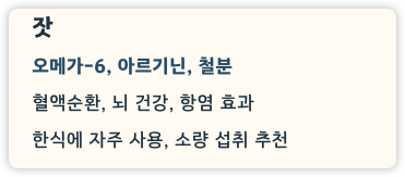 | 잣 | 약 673 kcal | 철분, 아르기닌 | 혈액순환, 뇌 건강 |
