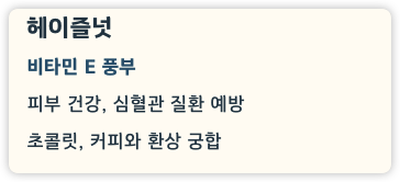 | 헤이즐넛 | 약 628 kcal | 비타민 E | 항산화, 심혈관 |