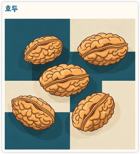 | 호두 | 약 654 kcal | 오메가-3 | 두뇌, 심혈관 건강 |