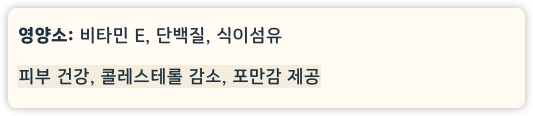 - 영양소: 비타민 E, 단백질, 식이섬유
