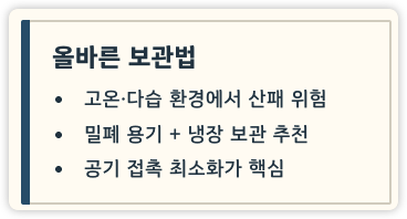 - 고온·다습한 환경에서 산패 위험