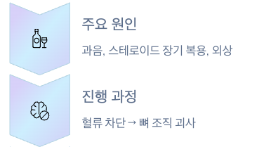 - 30~50대 남성에서 흔하며, 과음, 스테로이드 장기 복용, 고관절 충격이 주요 원인