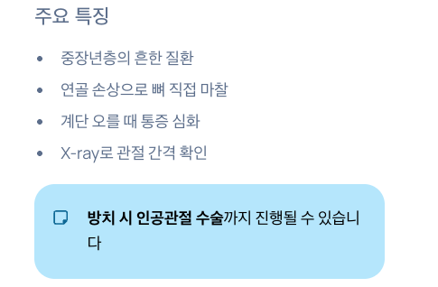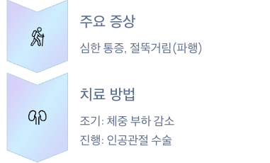 - 조기 발견 시 체중 부하 줄이기, 진행 시 인공관절 수술 필요