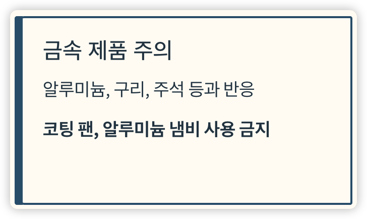 - 코팅된 팬, 알루미늄 냄비 등에는 사용하지 말 것
