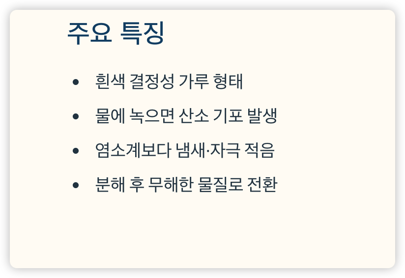 - 염소계 표백제와 달리 냄새가 적고 자극이 덜함