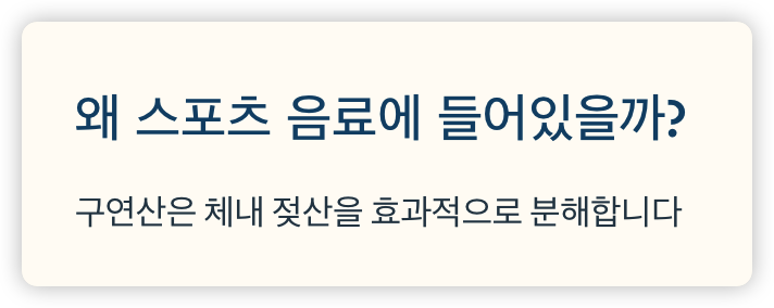- 구연산은 젖산을 분해하는 데 도움을 줘 피로물질 축적을 줄입니다.