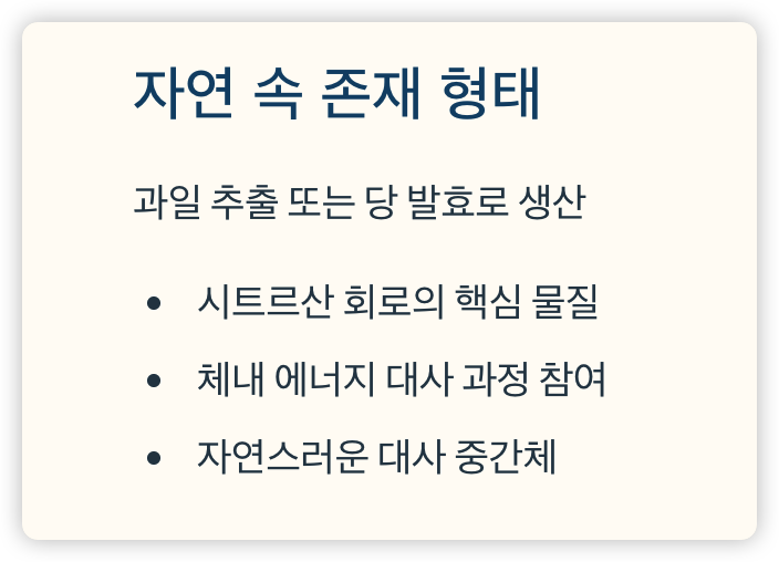 - 우리 몸에서도 에너지를 생성하는 시트르산 회로를 통해 대사 과정의 중간 물질로 존재합니다.