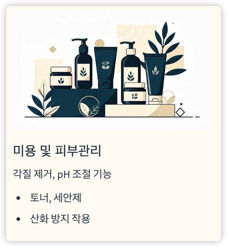 방부제, pH 조절제, 금속세척제, 스킨케어 화장품 성분으로도 널리 쓰입니다.