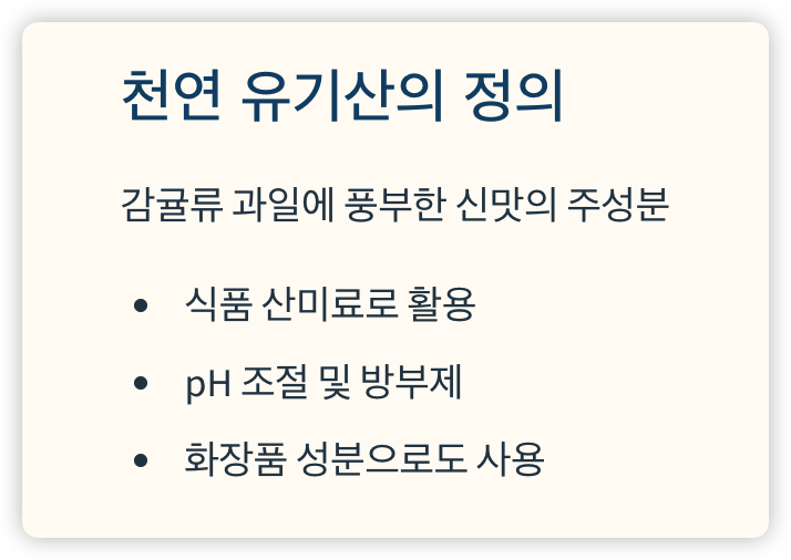 구연산(Citric Acid)은 과일, 특히 레몬, 라임, 오렌지 등 감귤류에 풍부하게 들어 있는 천연 유기산입니다.