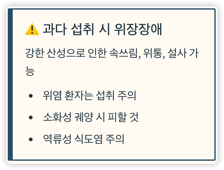 - 구연산은 강한 산성이므로 과다 복용 시 속쓰림, 위통, 설사 유발 가능