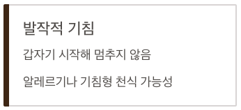 | 발작적 기침 | 갑자기 시작해 멈추지 않음. 알레르기나 기침형 천식 가능성 |