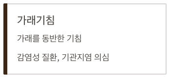 | 가래기침 | 가래를 동반한 기침. 감염성 질환, 기관지염 의심 가능 |