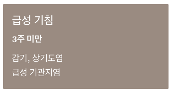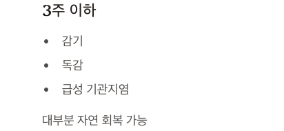 - 3주 이하: 감기, 독감, 급성 기관지염