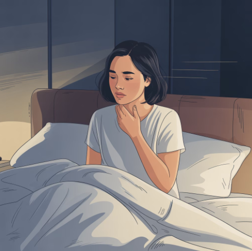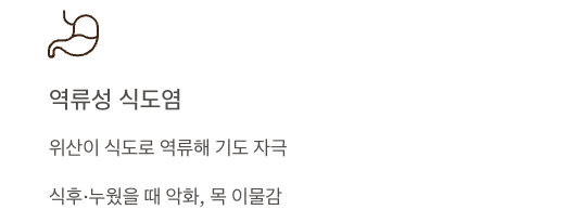 위산이 식도로 역류하여 기도와 후두를 자극함으로써 기침이 발생합니다. 식후 혹은 누웠을 때 기침이 심해지는 경우가 많으며, 목에 이물감, 쉰 목소리도 동반됩니다.