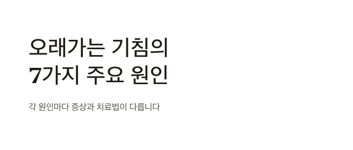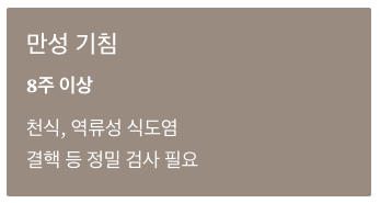 | 8주 이상 | 만성 기침 | 천식, 후비루, 역류성 식도염, 결핵 등 |