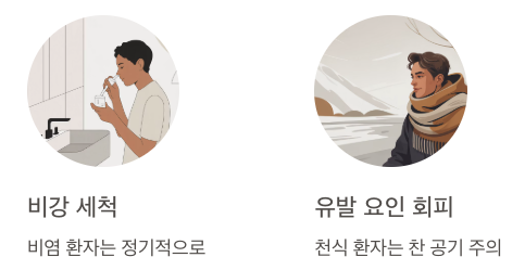 - 비염 환자는 정기적인 비강 세척 및 항알레르기제 사용