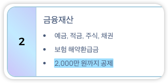 - 예금, 적금, 주식, 채권, 보험 해약환급금 등