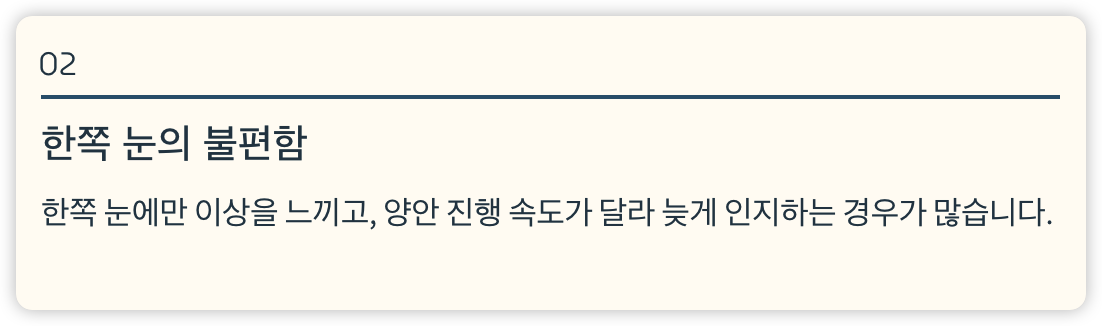 - 한쪽 눈에만 이상을 느낄 수 있으며, 이로 인해 증상을 놓치기도 합니다.