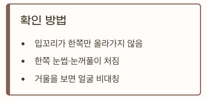 | F (Face) | 얼굴 마비 | 웃을 때 입이 한쪽으로만 올라가는지 확인 |