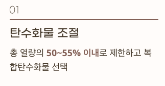 - 하루 섭취 탄수화물은 총 열량의 50~55% 이내로 제한