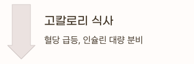 - 고칼로리, 고당분, 정제 탄수화물 위주의 식사는 혈당을 급격히 상승시키고, 인슐린 분비를 반복 자극합니다.
