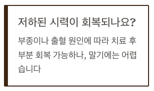 → 부종이나 출혈 원인에 따라 치료 후 시력 부분 회복 가능하나, 말기에는 회복이 어렵습니다.