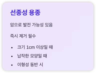 - 선종성 용종(Adenomatous Polyp): 암으로 발전 가능성 있음 → 제거 필수