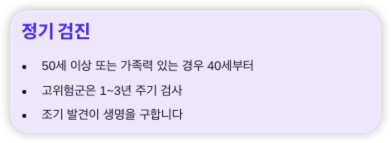 - 50세 이상 또는 가족력 있는 경우, 40세부터 검사 권장