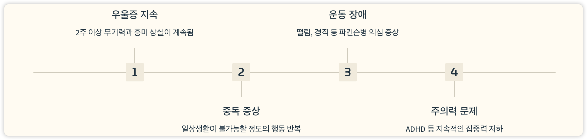 - 증상이 심각할 경우 정신건강의학과 방문 필요
