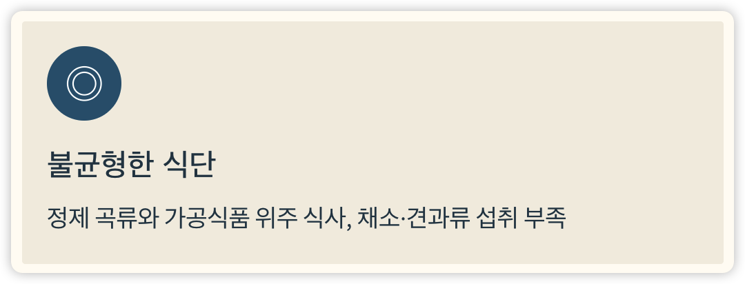 - 정제된 곡류나 가공식품 위주의 식사