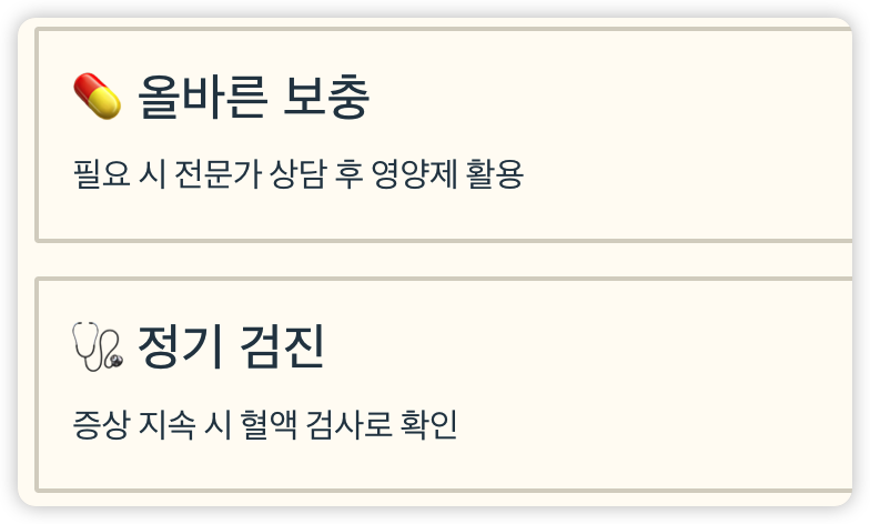 - 단, 혈중 수치가 정상이더라도 세포 내 결핍일 수 있음 → 증상 동반 시 주의 필요