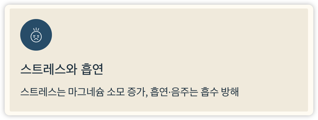 - 스트레스는 마그네슘 소모를 증가시킴