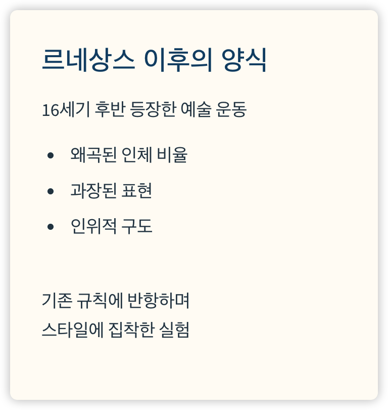 📌 예술사에서의 매너리즘은 기계적 반복이 아니라 ‘의도된 형식화’에 더 가깝습니다.