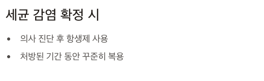 - 세균 감염 확정 시에만 항생제 사용 (의사 진단 필요)