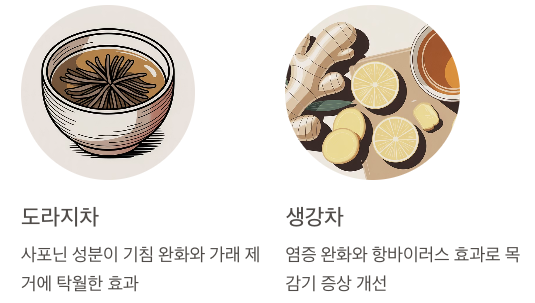 - 도라지차: 사포닌 성분이 기침 완화와 가래 제거에 효과