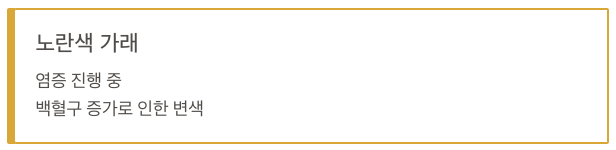 | 노란색 | 염증 진행, 백혈구 증가 – 바이러스 또는 세균 감염 가능성 |