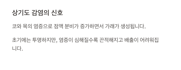 - 감염에 따른 염증으로 점액 분비가 증가하여 가래가 생깁니다.